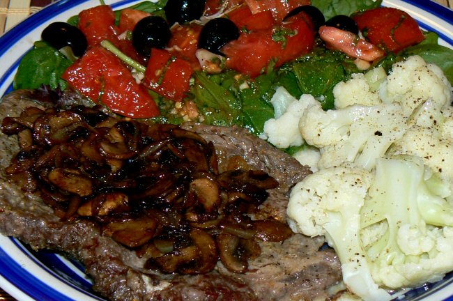 Pan fried steak topped with onions & sliced mushrooms (sautéed in butter with spices, a splash of Magi seasoning & burgundy wine), buttered steamed cauliflower and salad.
