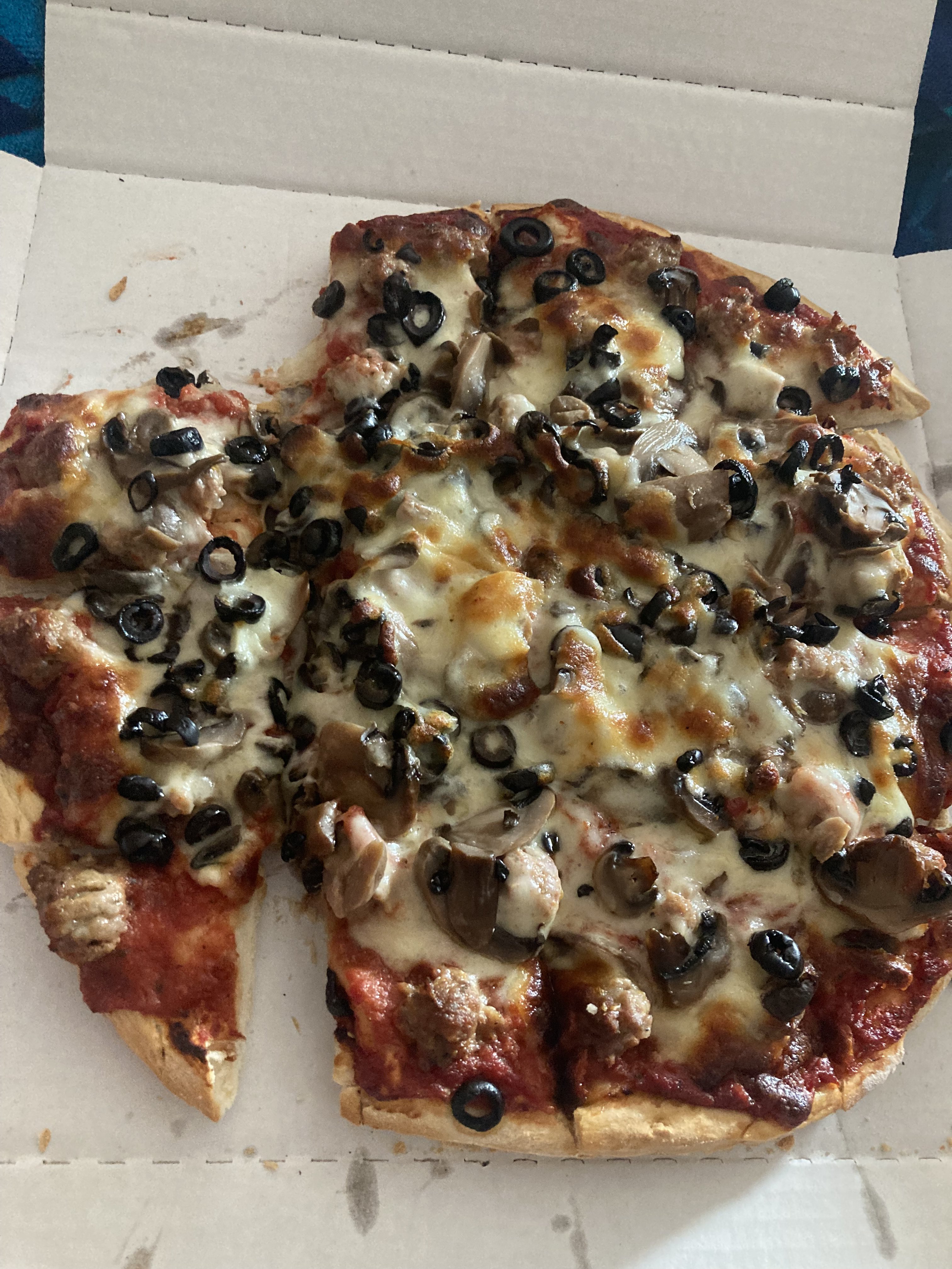 Jim’s pizza. This is our favorite pizza place, anywhere. 12” thick sausage mushrooms and black olives. I love a sweet pizza sauce